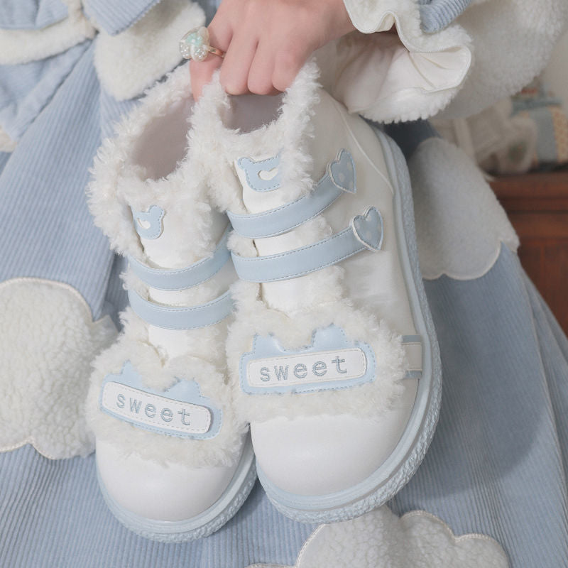 Korean Blue Warm Plush Kawaii Sweet Heart Shoes